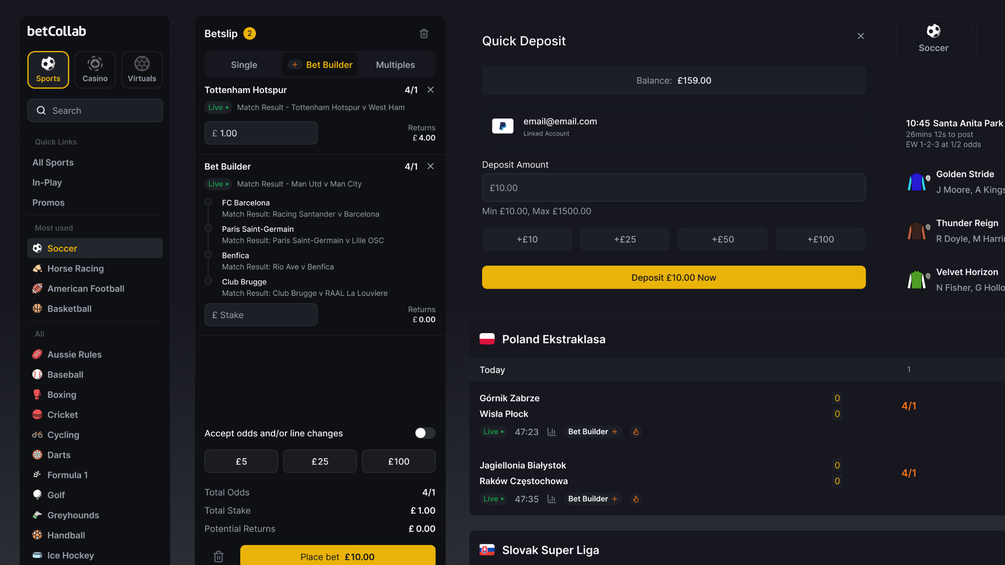 betCollab Lite provides core betting UI components, a homepage template, and web-ready layouts designed specifically for sportsbook products. It includes a dark theme foundation and a commercial license for use in a single sportsbook product.